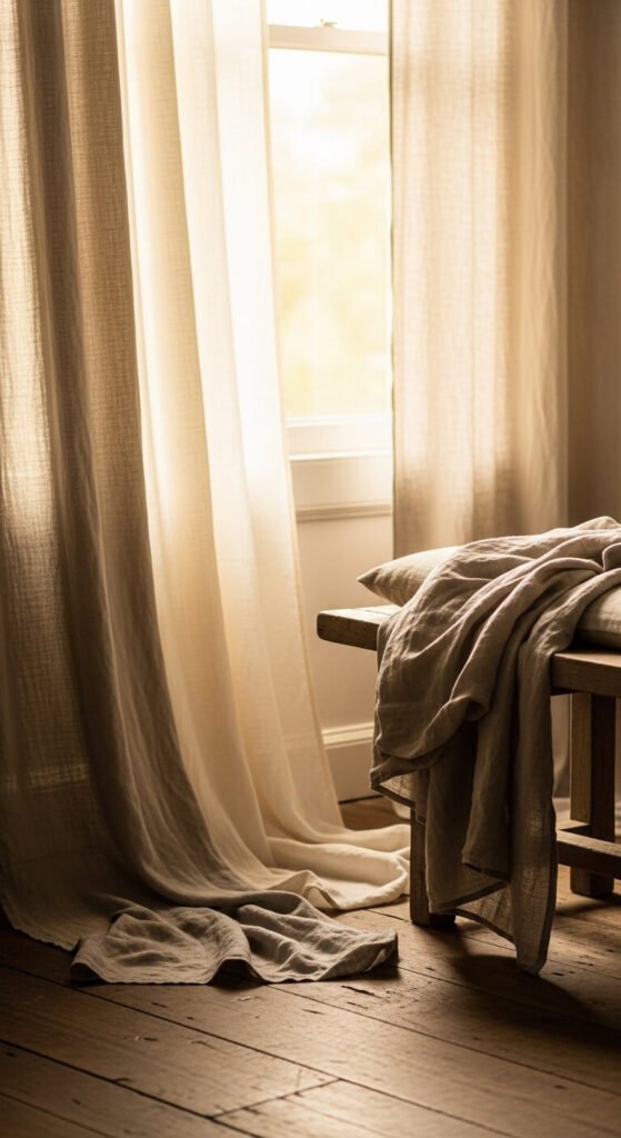 Wabi-sabi spaces lean into undyed, natural textiles. Linen is the go-to choice. It wrinkles beautifully. It softens over time. You do not need to iron it. Layer linen throws over chairs, hang linen curtains unlined, toss a linen pillow on the floor. IKEA and thrift stores carry affordable linen pieces. Wash them often so they fade gently. That faded, lived-in look is exactly the point.