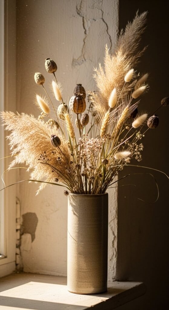 Fresh flowers die. Dried botanicals last for years — and look even better as they age. Head outside and forage seed pods, dried grasses, eucalyptus, or bare branches. Arrange them loosely in a clay pot or old bottle. No floristry skills required. The more imperfect the arrangement, the better. Dried pampas, cotton stems, and honesty plants are cheap at craft stores. These arrangements age gracefully, which is the whole idea.