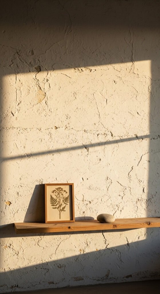 Western interiors often cover every wall. Wabi-sabi asks you to resist that urge. A bare plaster wall with texture and age is its own artwork. If you want something up, choose one piece — small, simple, honest. Press a found leaf into a frame. Hang a single piece of handmade paper. Leave most of the wall empty and let the texture do the work. Bare walls also make a room feel quieter, which is the goal.