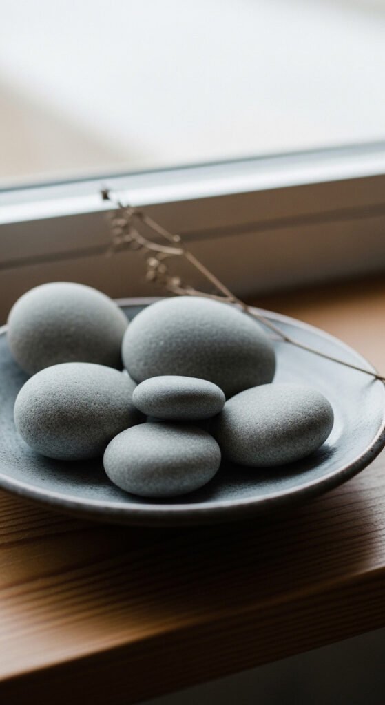 Stones are free. Collect them on a walk and bring them home. River rocks make beautiful paperweights, shelf decor, and bathroom accents. Place a flat slate stone under a candle. Stack three smooth stones on a windowsill. Fill a low dish with pebbles from the garden. There is no cost, no effort, and no wrong way to do it. Rocks age without changing. They are the most wabi-sabi object you can find.