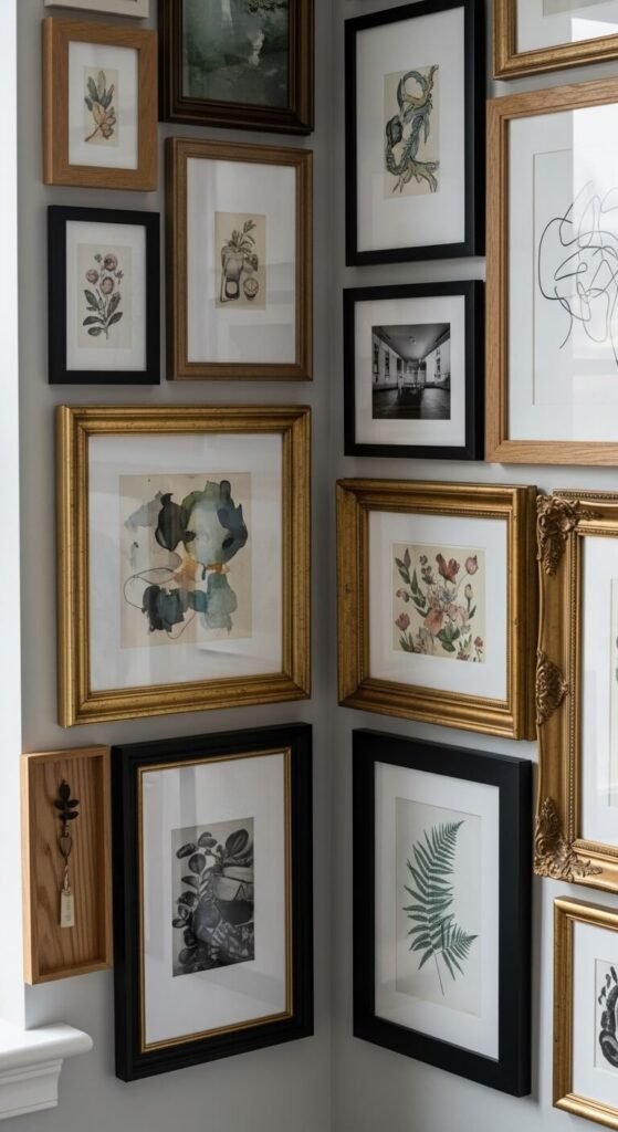 The trick is to pick one unifying element — whether that’s color, finish, or matting style — and let everything else vary freely. This gives the wall a collected, personal feel rather than a catalog-bought look.