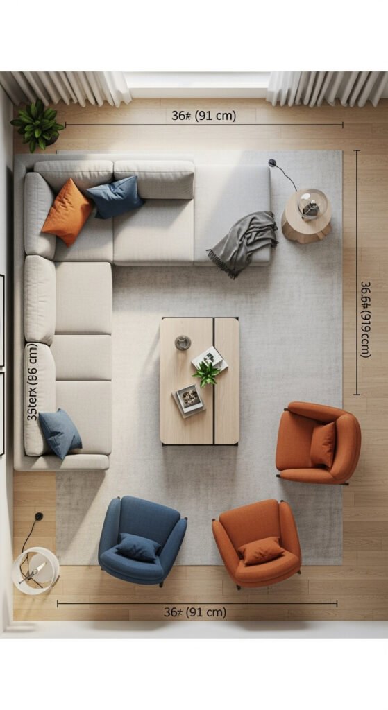 Here’s a game-changer: You need at least 30-36 inches of walking space between furniture pieces. This magic number ensures you can move through the room without doing an awkward sideways shuffle.