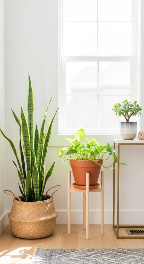 Hanging planters: Suspend them at different drop lengths—one high in a corner, another lower near a window—to add dimension throughout the room.