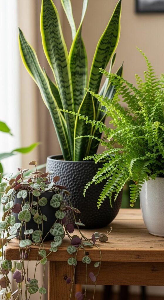 This trio creates what designers call the “visual triangle,” naturally guiding the eye through your space. Start with one tall statement plant, add a medium-height companion, then fill in with smaller accents. It’s that simple!