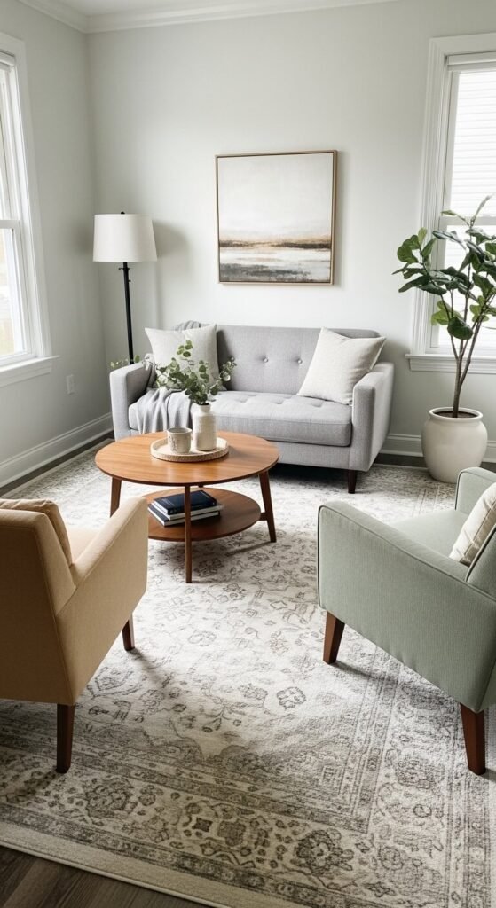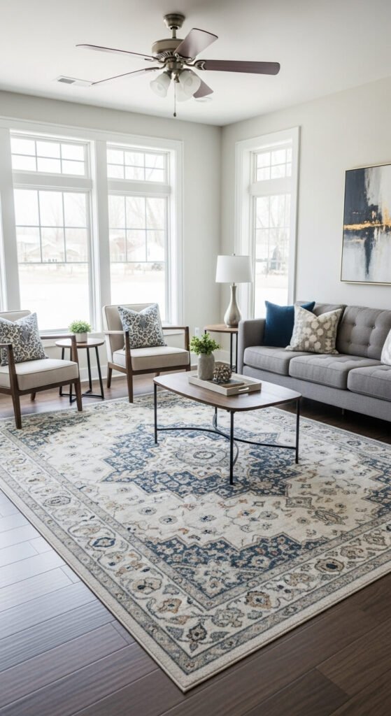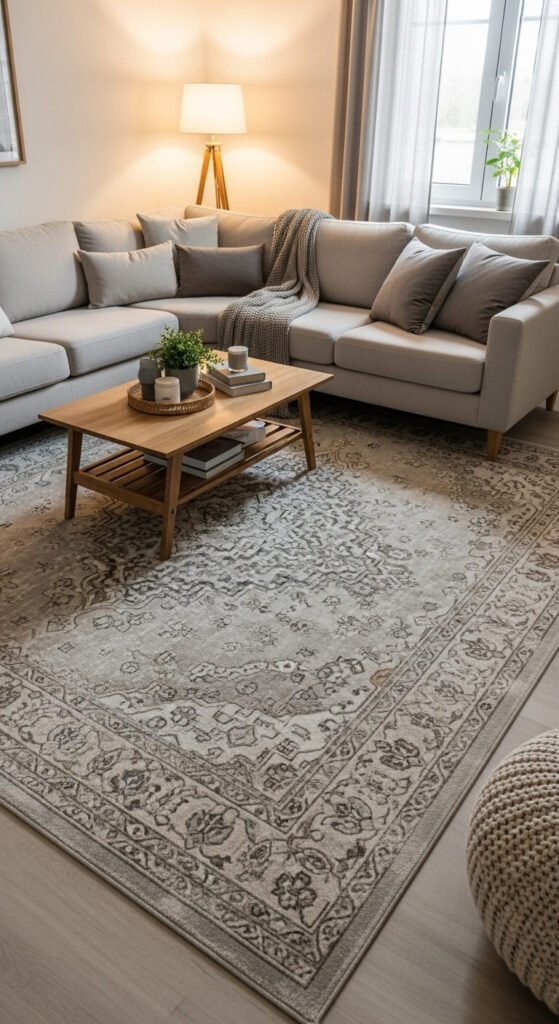 Pro tip: Leave 12-18 inches of bare floor between your rug edge and the walls. This creates a beautiful “frame” effect and makes your room feel more spacious.