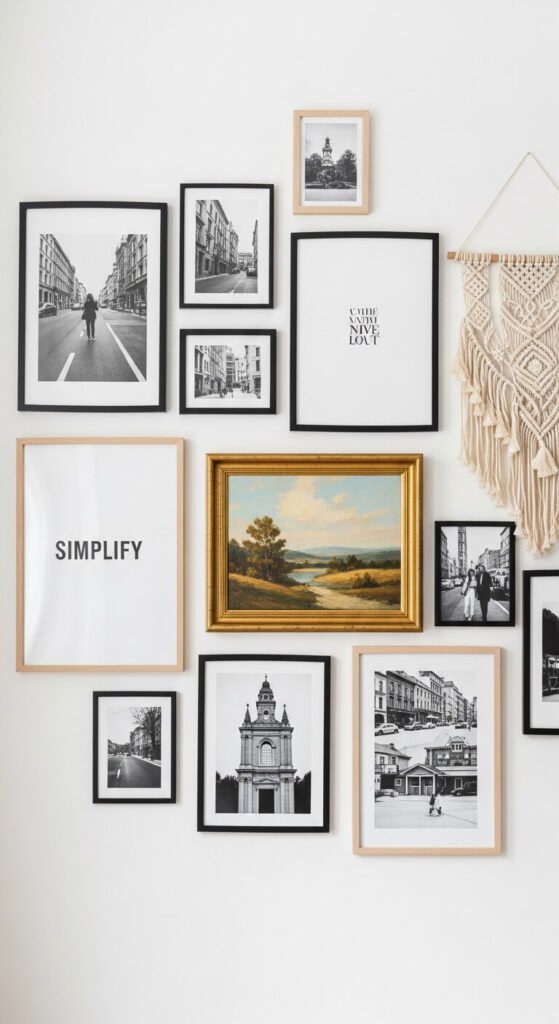 A room full of identically framed prints can feel flat. Mixing mediums adds life and dimension.