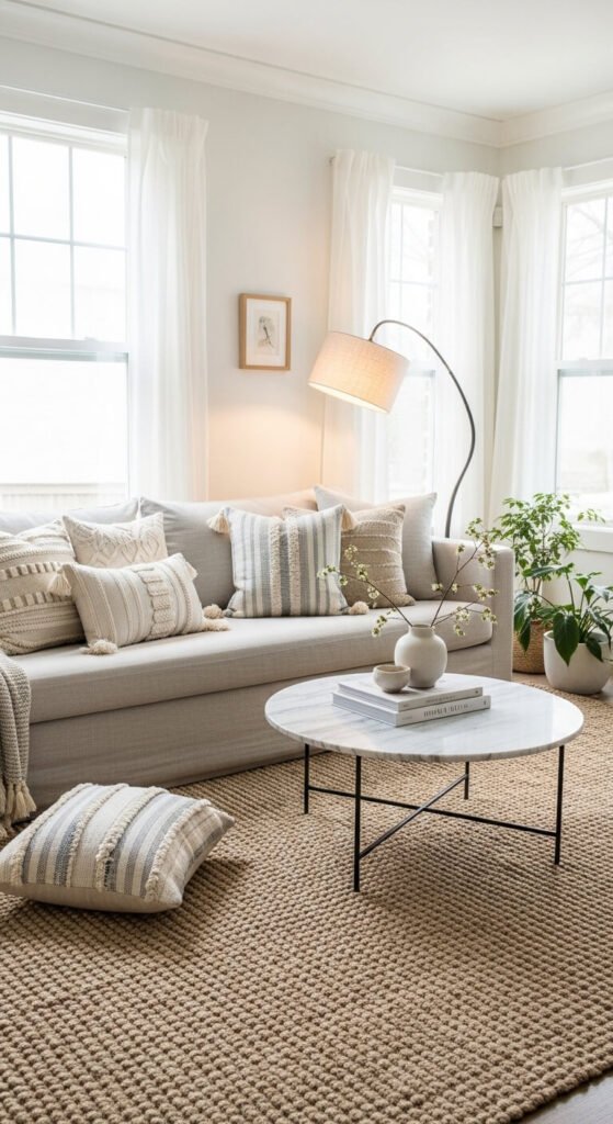 The foundation of any sophisticated living room is a calm, neutral palette. Think warm whites, soft taupes, greiges, and muted sage greens. These shades create a serene backdrop that lets your furniture and décor do the talking.