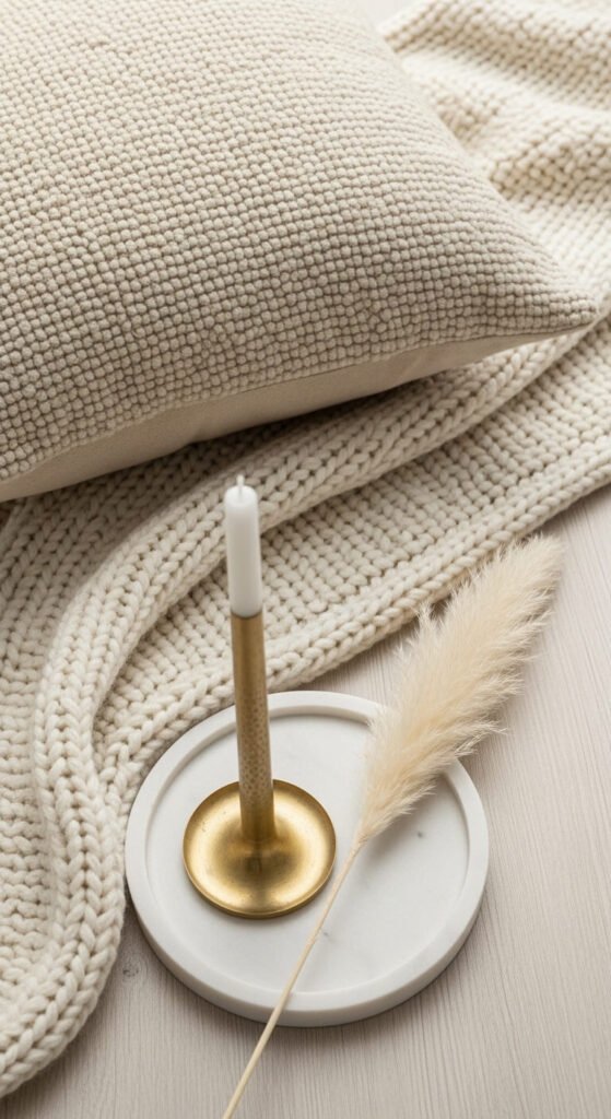 - Accent light: Candles, table lamps, or LED strips behind shelving for depth