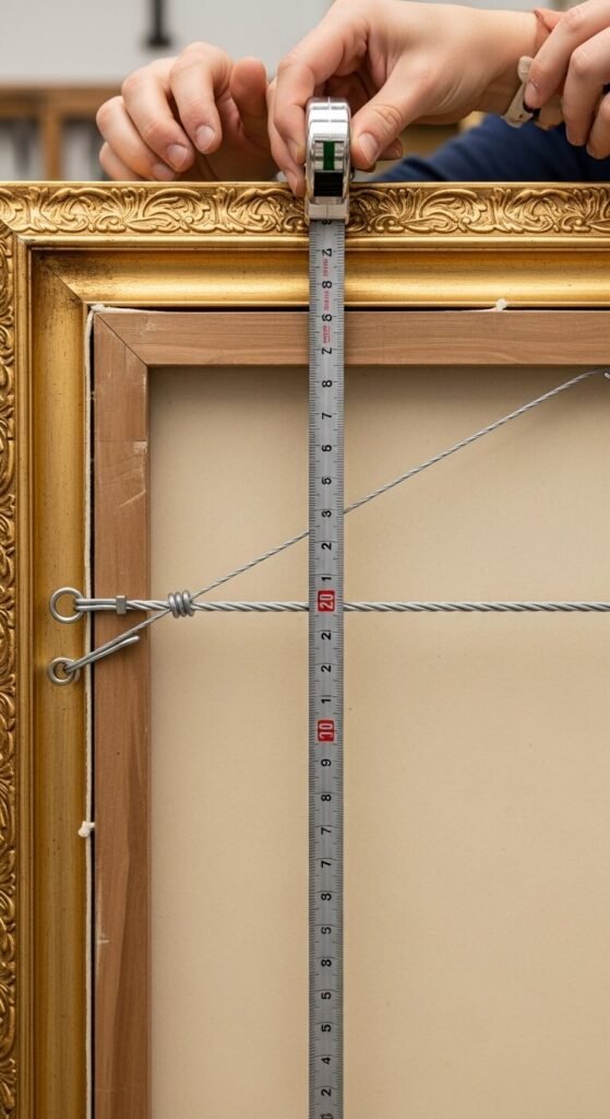 - Account for the hanging hardware – Measure from the top of your frame to where the wire or hook sits when pulled taut