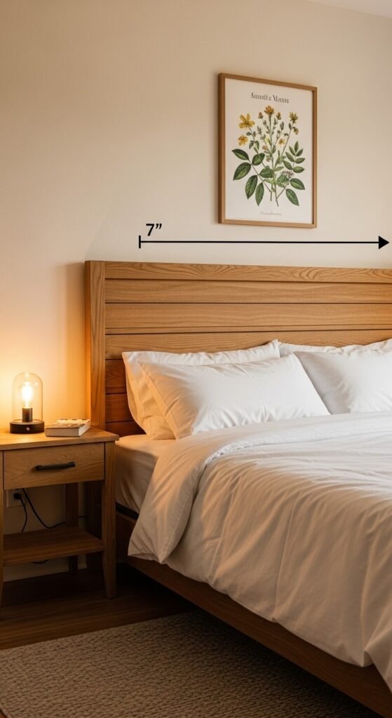 Above furniture: If you’re hanging art above a sofa, console table, or bed, leave 6-8 inches between the furniture top and the bottom of the frame. The art should feel connected to the furniture piece, creating a cohesive look.