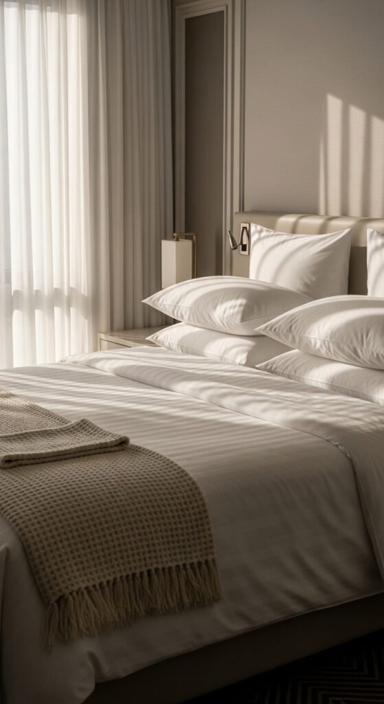 - Crisp fitted sheet: Go for 400–600 thread count cotton or a sateen weave. White or light neutral tones are your best friend here. They photograph beautifully and feel luxurious against skin.