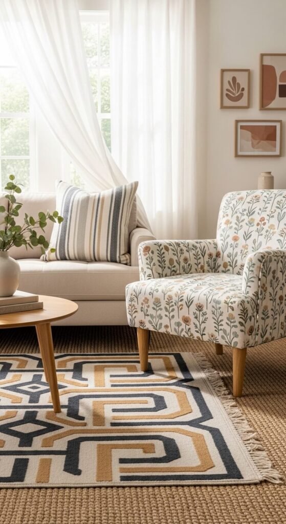 - Neutrals (cream, tan, grey, black) are your best friends — they let louder prints breathe.