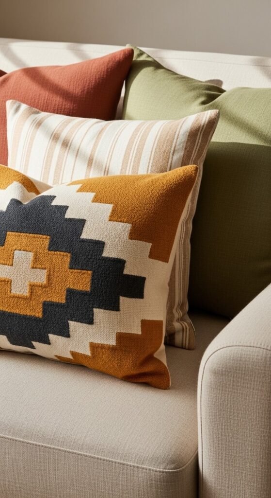 - Textured neutrals (bouclé, jute, velvet) add depth without adding more print.
