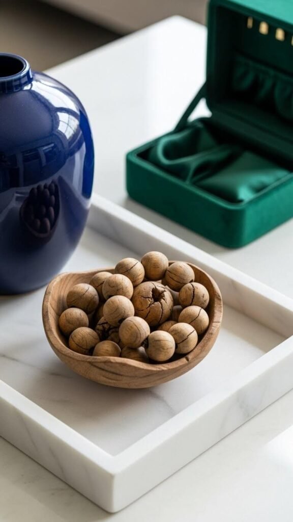 - Mix low-profile items like decorative bowls or trays