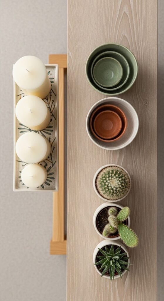 Here’s a designer secret that instantly elevates any display: group items in odd numbers. Three candlesticks look more intentional than two or four. A single large vase makes a bolder statement than a matched pair.