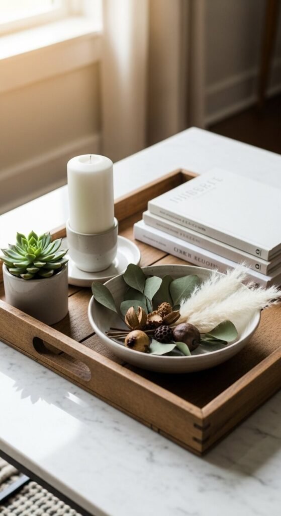 If there’s one secret weapon in tray styling, it’s this: add something alive. A small plant, a succulent, a stem of eucalyptus, or even a bundle of dried flowers instantly makes a tray feel fresh and intentional rather than staged.