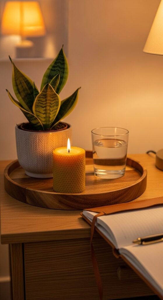 - Anchor with height — Start with your tallest item. A candle, a small vase with stems, or a lantern works perfectly.