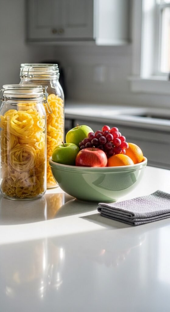 Even the most beautiful counter can slide back into chaos. The solution isn’t more storage — it’s a simple habit: a 5-minute counter reset every Sunday evening.